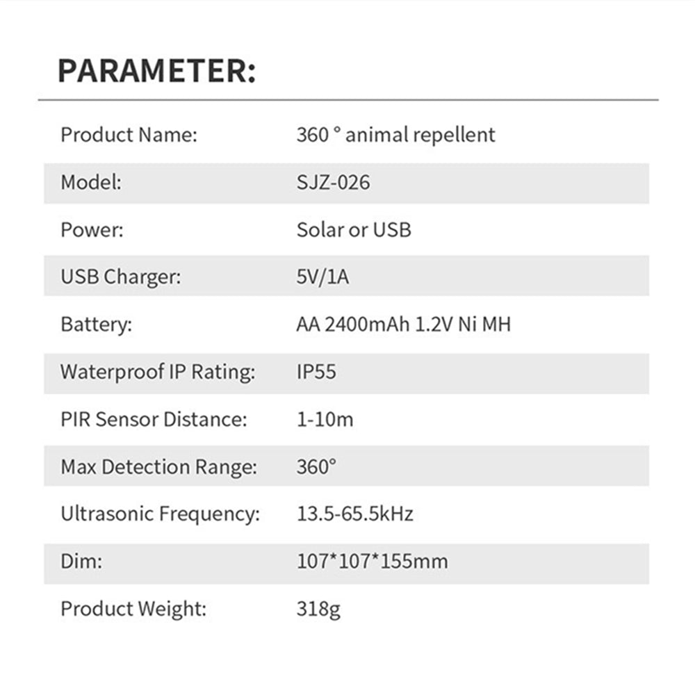 Featuring 360° motion detection and advanced ultrasonic technology (13.5 kHz–65 kHz), it emits strong ultrasonic waves, flashing lights, and optional alarm sounds to scare off intruding animals such as cats, dogs, foxes, squirrels, and birds.