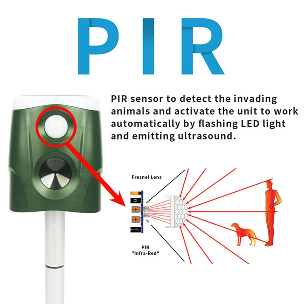 360° Ultrasonic Coverage: Detects and repels animals up to metres away with PIR motion sensors.